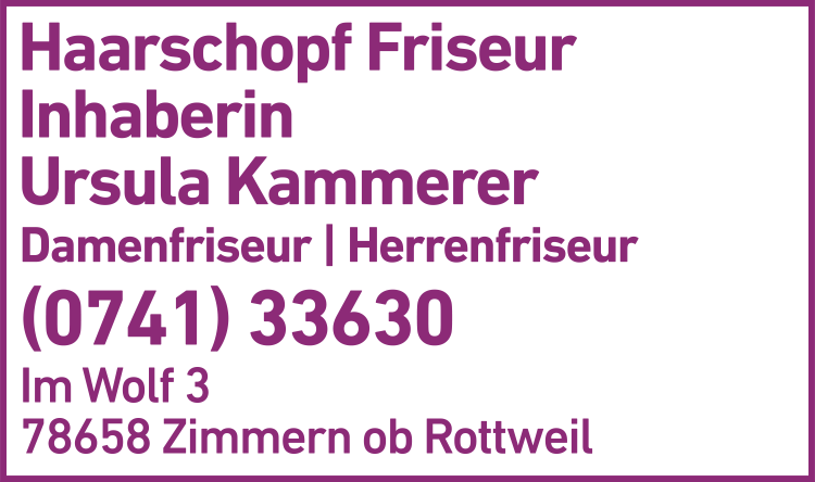 Die Adresse von Haarschopf Inh. Kammerer Ursula Friseur lautet: Im Wolf 3, 78658 Zimmern