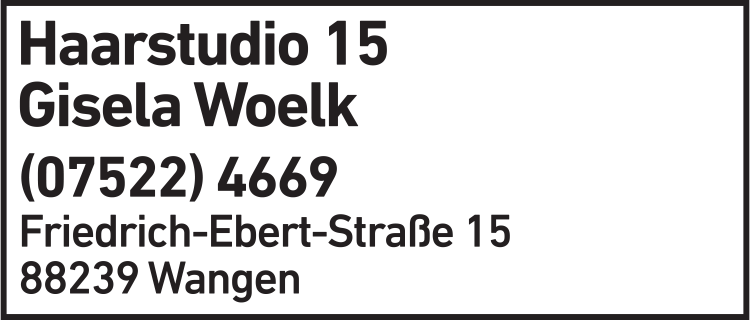 Haarstudio 15 Inh. Gisela Woelk 07522 46 69 Wangen im Allgäu Friedrich-Ebert-Str. 15 88239