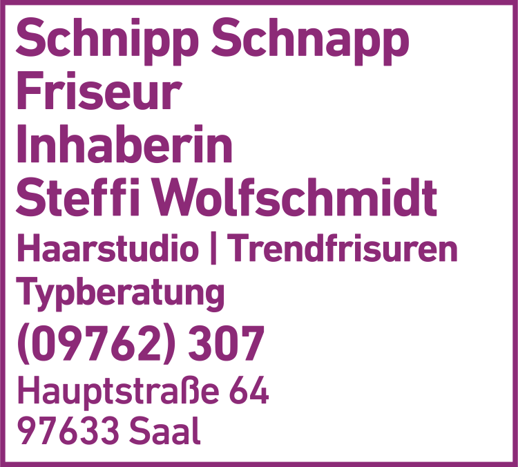 Die Adresse von Haarstudio Schnipp Schnapp Steffi Wolfschmidt lautet: Hauptstr. 64, 97633 Saal a d Saale