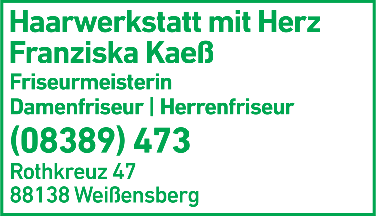 Die Adresse von Haarwerkstatt mit Herz, Franziska Kaeß Friseurmeisterin lautet: Rothkreuz 47, 88138 Weißensberg