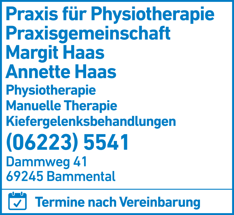 Haas Margit u. Haas Annette Praxis für Physiotherapie 06223 55 41 Bammental Dammweg 41 69245 Reilsheim