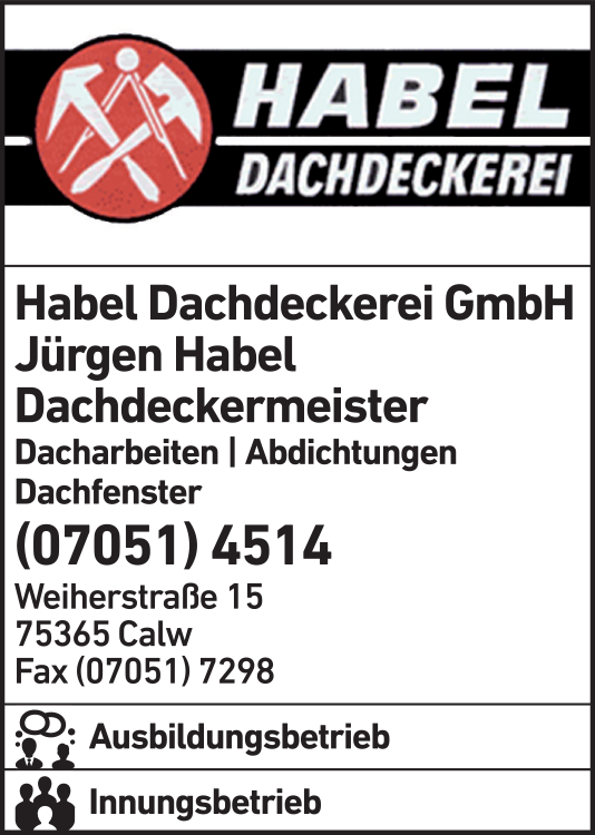 Die Adresse von Habel Dachdeckerei GmbH lautet: Weiherstr. 15, 75365 Calw