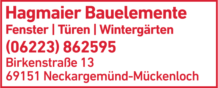 Die Adresse von Hagmaier Bauelemente lautet: Birkenstr. 13, 69151 Neckargemünd-Mückenloch