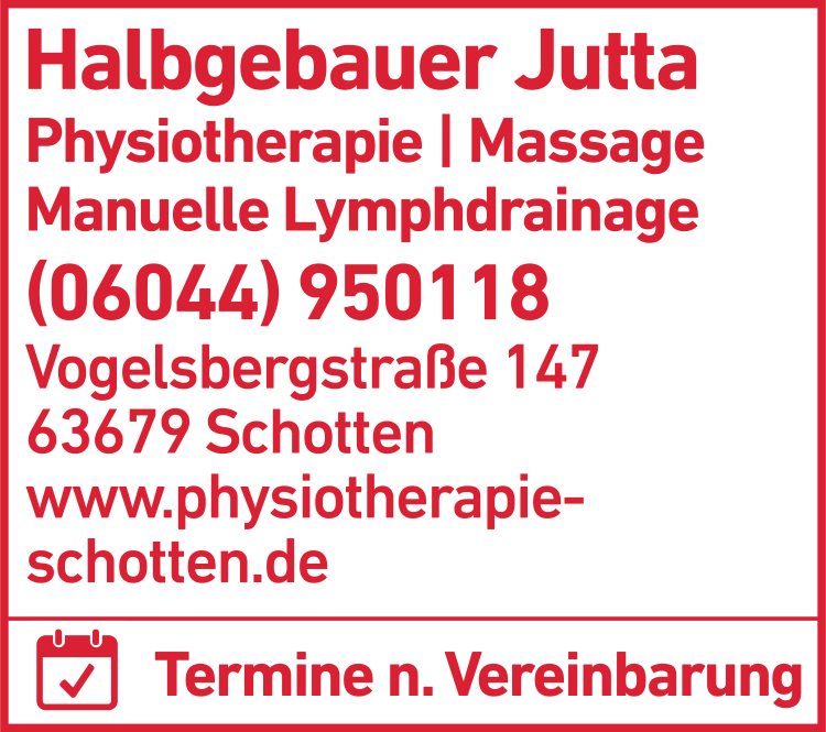 Die Adresse von Halbgebauer Jutta Krankengymnastik lautet: Vogelsbergstr. 147, 63679 Schotten