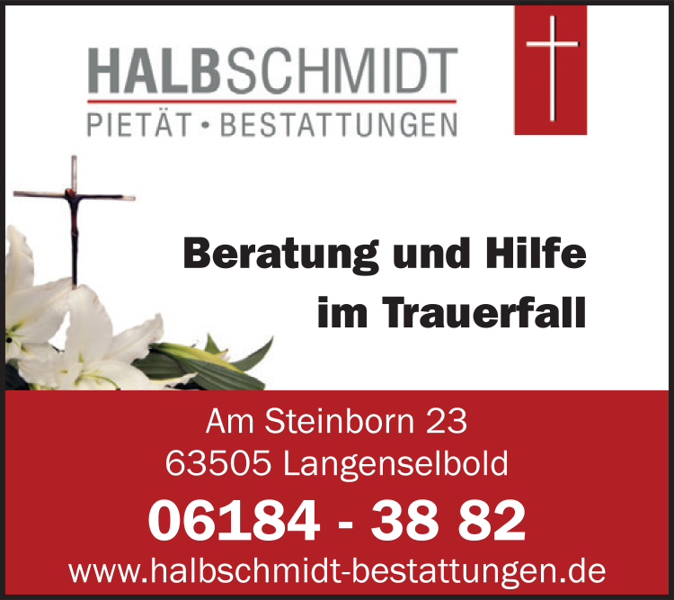 Die Adresse von Halbschmidt Bestattungen lautet: Am Steinborn 23, 63505 Langenselbold