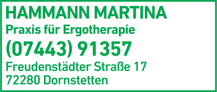 Die Adresse von Hammann Martina Praxis für Ergotherapie lautet: Freudenstädter Str. 17, 72280 Dornstetten