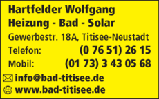 Die Adresse von Hartfelder Wolfgang lautet: Gewerbestr. 18 A, 79822 Titisee-Neustadt
