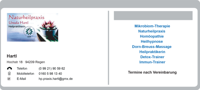 Hartl Ursula, Naturheilpraxis bietet Naturheilpraxis, Homöopathie, Heilpraktiker, Heilhypnose, Dorn Breuss Massage, Heilpraktikerin, Akupunktur, Bioresonanztherapie, ausleitende Verfahren und Darmsanierung an.