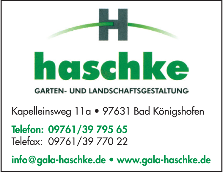 Die Adresse von Haschke Garten- und Landschaftsgestaltung lautet: Kapelleinsweg 11 a, 97631 Bad Königshofen i Grabfeld