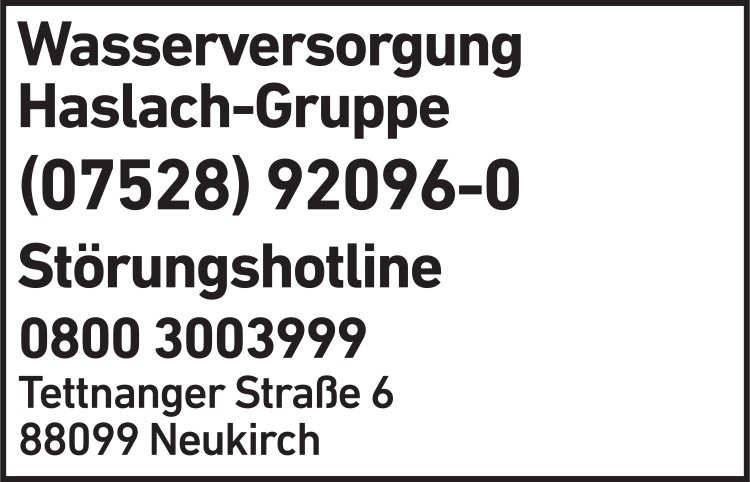 Die Adresse von Haslach-Wasserversorgung lautet: Tettnanger Str. 6, 88099 Neukirch