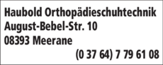 Die Adresse von Haubold Orthopädieschuhtechnik lautet: August-Bebel-Str. 10, 08393 Meerane