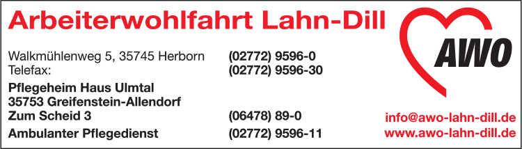 Die Adresse von Haus Ulmtal Senioren- und Pflegeheim lautet: Zum Scheid 3, 35753 Greifenstein-Allendorf