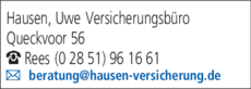 Die Adresse von Hausen Uwe lautet: Queckvoor 56, 46459 Rees