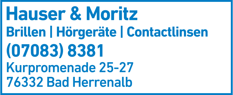 Die Adresse von Hauser & Moritz Brillen e.K. lautet: Kurpromenade 25-27, 76332 Bad Herrenalb