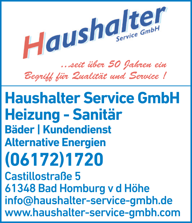 Die Adresse von Haushalter Service GmbH Heizung, Sanitär lautet: Castillostr. 5, 61348 Bad Homburg