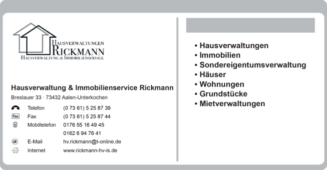 Hausverwaltung & Immobilienservice Rickmann bietet Hausverwaltungen, Immobilien, Sondereigentumsverwaltung, Häuser, Wohnungen, Grundstücke, Mietverwaltungen, Wohnen auf Zeit, Studentenzimmer und Haus- und Grundstücksverwaltungen an.