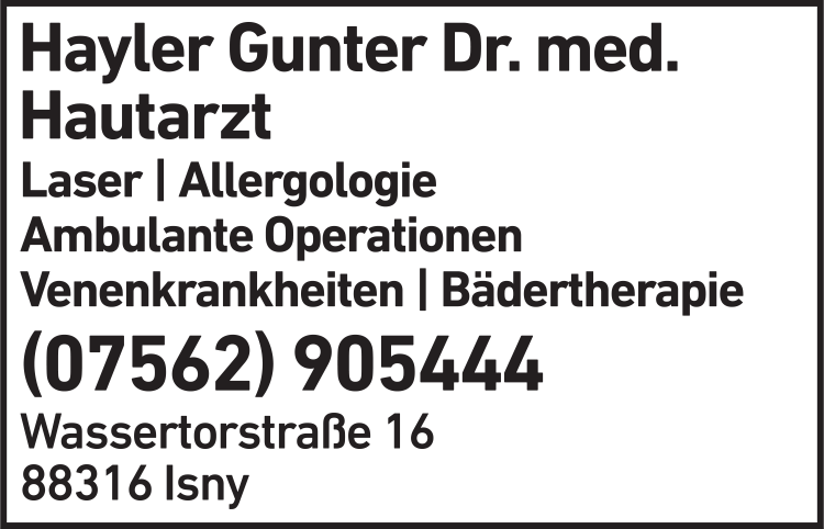 Die Adresse von Hayler Gunter Dr. med. Hautarzt lautet: Wassertorstr. 16, 88316 Isny