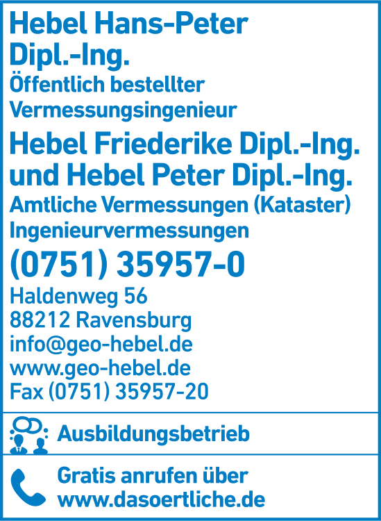 Die Adresse von Hebel Hans-Peter Dipl.-Ing., Hebel Friedericke Dipl.-Ing., Hebel Peter Dipl.-Ing. GbR Vermessungsbüro lautet: Haldenweg 56, 88212 Ravensburg