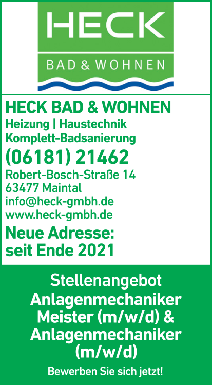 Heck GmbH Heizung - Bäder 06181 2 14 62 Maintal Robert-Bosch-Str. 14 63477 Dörnigheim