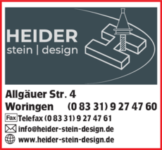 Die Adresse von Heider Stein Design lautet: Allgäuer Str. 4, 87789 Woringen