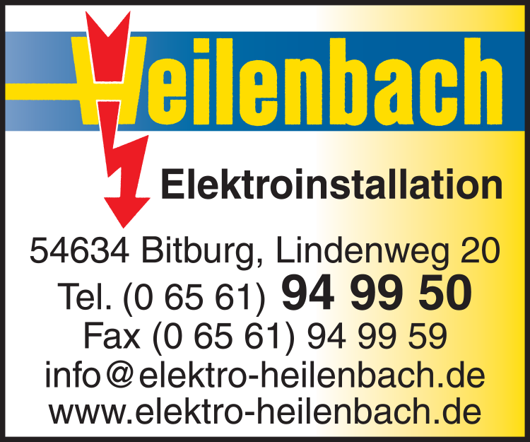 Die Adresse von Heilenbach Elektro Inh. Michael Heilenbach lautet: Lindenweg 20, 54634 Bitburg