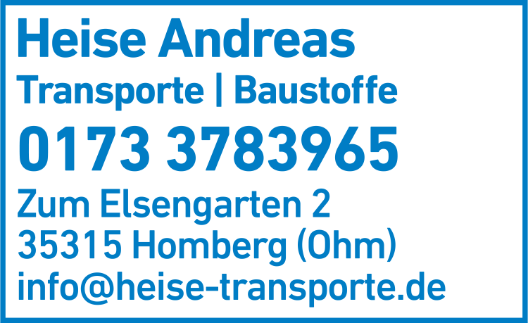Die Adresse von Heise Andreas Transporte und Baustoffe lautet: Zum Elsengarten 2, 35315 Homberg