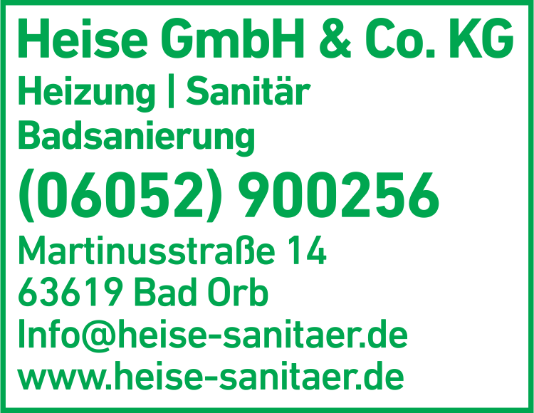 Die Adresse von Heise GmbH & Co. KG Heizung - Sanitär lautet: Martinusstr. 14, 63619 Bad Orb