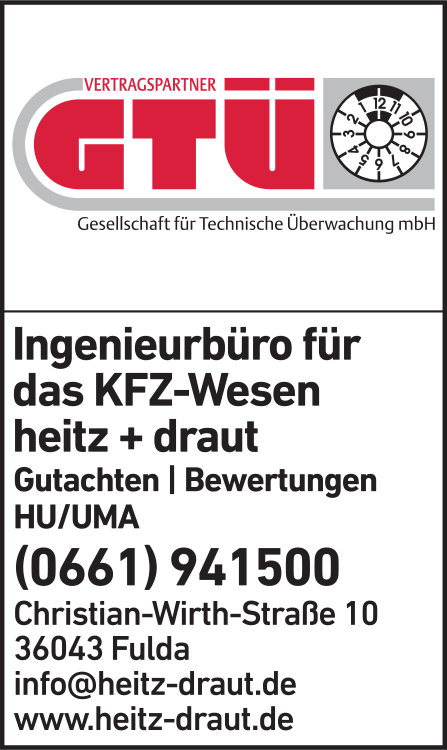 Heitz und Draut Ingenieurbüro für Kfz-Wesen 0661 9 41 50-0 Fulda Christian-Wirth-Str. 10 36043 Kohlhaus