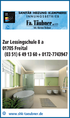 Die Adresse von Heizung-Sanitär Klempnerei Fa. Täubner lautet: Zur Lessingschule 8 A, 01705 Freital