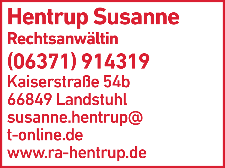 Die Adresse von Hentrup Susanne Rechtsanwältin lautet: Kaiserstr. 54 b, 66849 Landstuhl