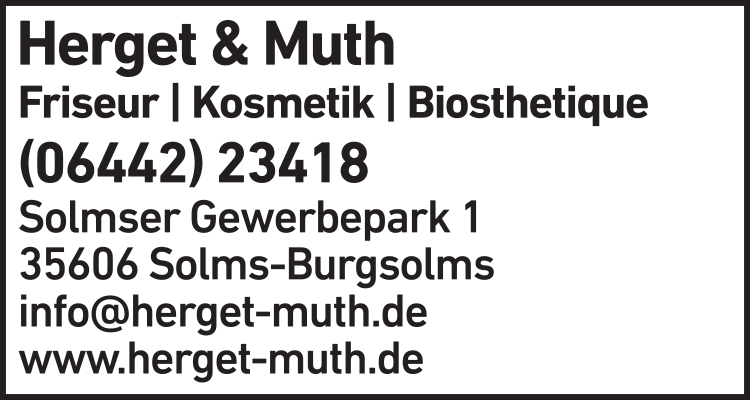 Die Adresse von Herget & Muth Biosthetique lautet: Solmser Gewerbepark 1, 35606 Solms-Burgsolms