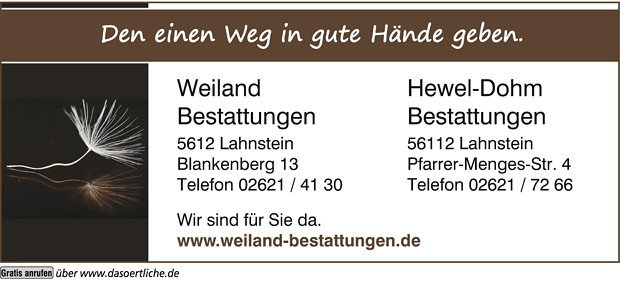 Die Adresse von Hewel-Dohm Bestattungen Lahnstein lautet: Blankenberg 13, 56112 Lahnstein