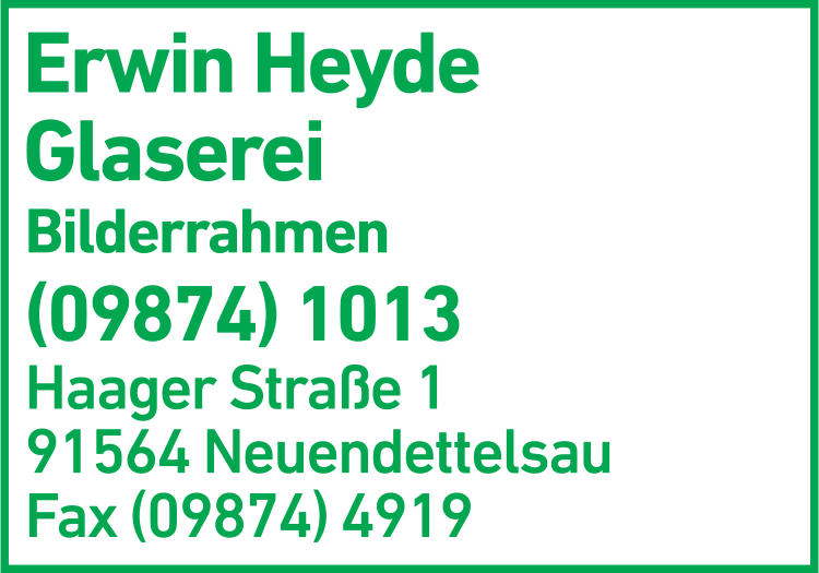 Die Adresse von Heyde Erwin Glaserei lautet: Haager Str. 1, 91564 Neuendettelsau