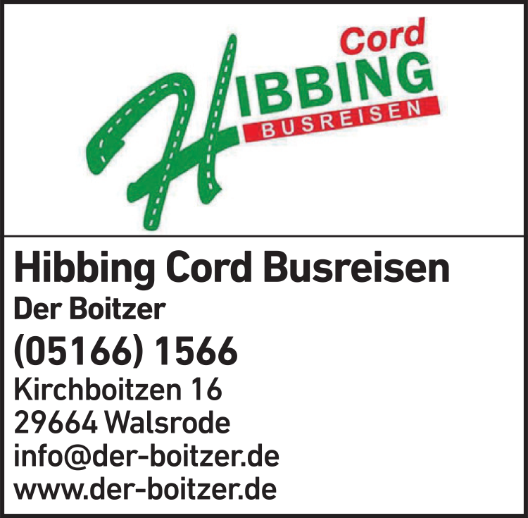 Die Adresse von Hibbing Cord Heinrich Busreisen lautet: Kirchboitzen 16, 29664 Walsrode