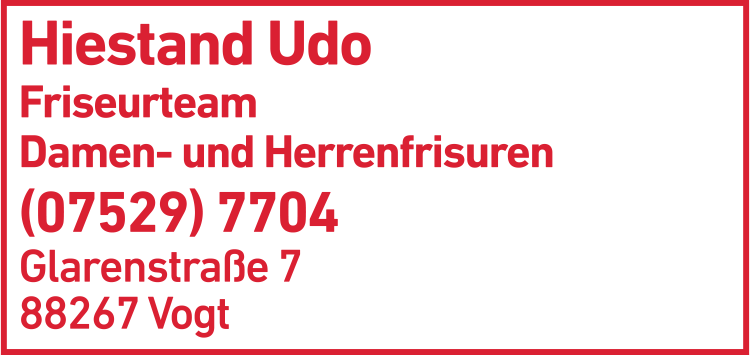 Die Adresse von Hiestand Udo Friseur lautet: Glarenstr. 7, 88267 Vogt