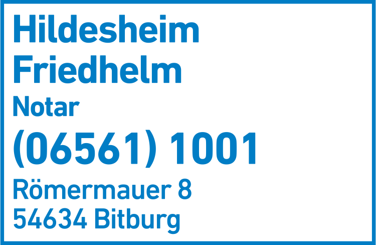 Die Adresse von Hildesheim Friedhelm Notar lautet: Römermauer 8, 54634 Bitburg