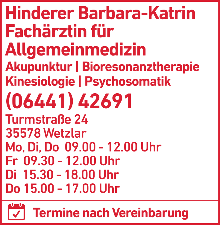 Die Adresse von Hinderer Barbara-Katrin Fachärztin für Allgemeinmedizin lautet: Turmstr. 24, 35578 Wetzlar