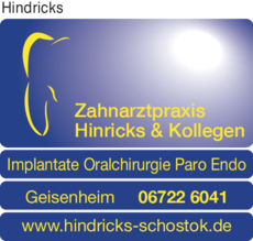 Hindricks & Kollegen Zahnarztpraxis hat montags bis freitags von 08:00 - 18:00 Uhr geöffnet.