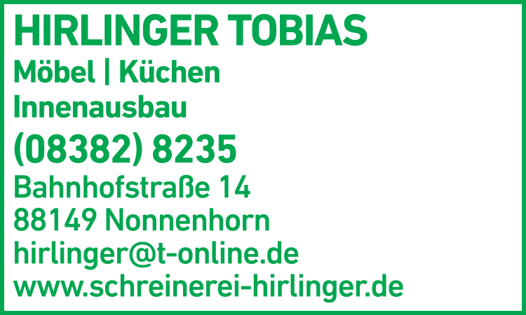 Die Adresse von Hirlinger Tobias Schreinerei lautet: Bahnhofstr. 12-14, 88149 Nonnenhorn