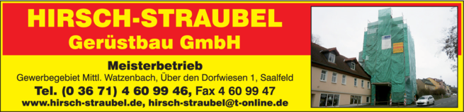 Die Adresse von Hirsch - Straubel, Gerüstbau GmbH lautet: Über den Dorfwiesen 1, 07318 Saalfeld