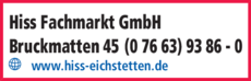 Die Adresse von Hiss Fachmarkt lautet: Bruckmatten 45, 79356 Eichstetten