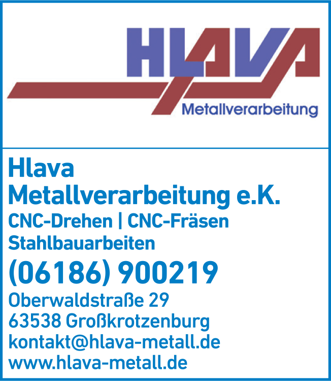 Die Adresse von Hlava Metallverarbeitung e.K. lautet: Oberwaldstr. 29, 63538 Großkrotzenburg