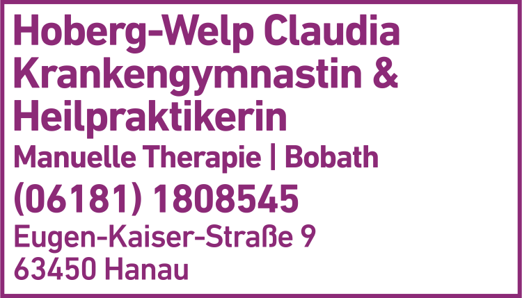 Die Adresse von Hoberg-Welp Claudia Praxis für Physiotherapie und Naturheilkunde lautet: Eugen-Kaiser-Str. 9, 63450 Hanau