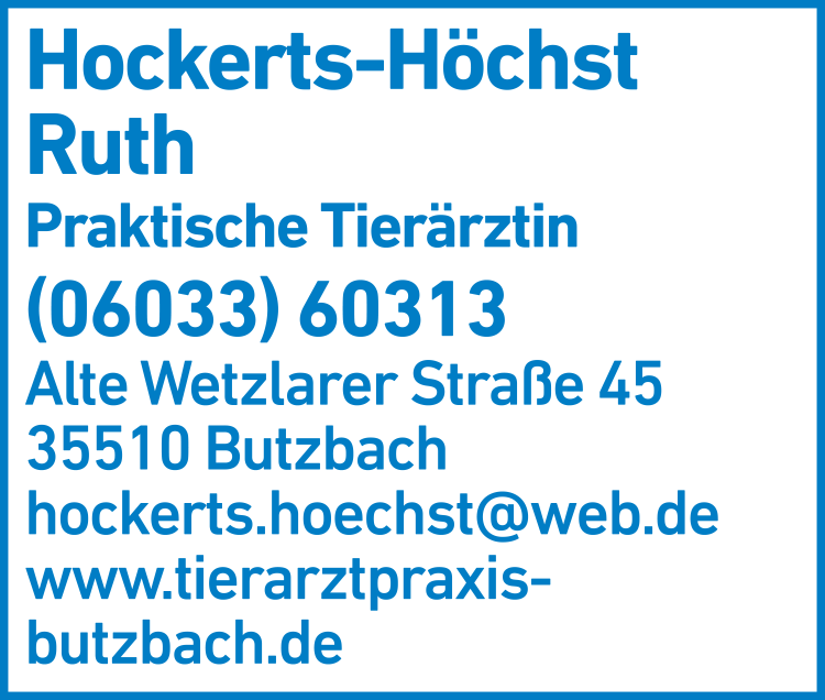 Die Adresse von Hockerts-Höchst Ruth Prakt. Tierärztin lautet: Alte Wetzlarer Str. 45, 35510 Butzbach