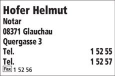 Die Adresse von Hofer Helmut lautet: Quergasse 3, 08371 Glauchau