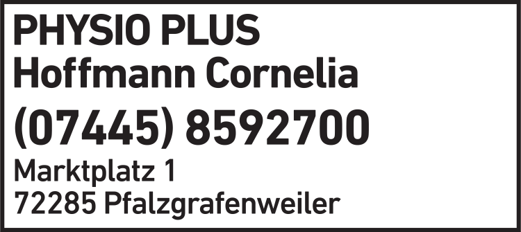 Die Adresse von Hoffmann Cornelia PHYSIO PLUS lautet: Marktplatz 1, 72285 Pfalzgrafenweiler