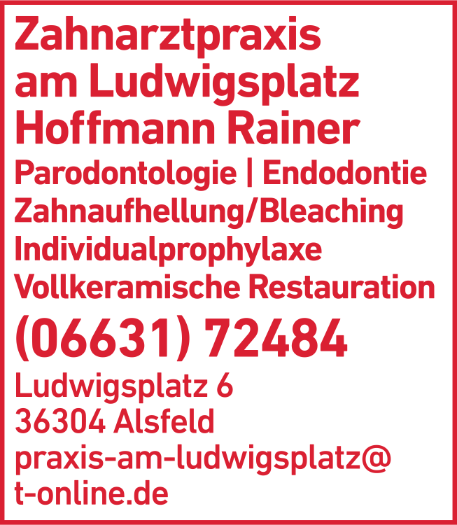 Die Adresse von Hoffmann Rainer Zahnarztpraxis am Ludwigsplatz lautet: Ludwigsplatz 6, 36304 Alsfeld