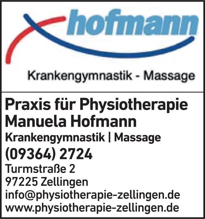 Die Adresse von Hofmann Manuela Praxis für Physiotherapie lautet: Turmstr. 2, 97225 Zellingen