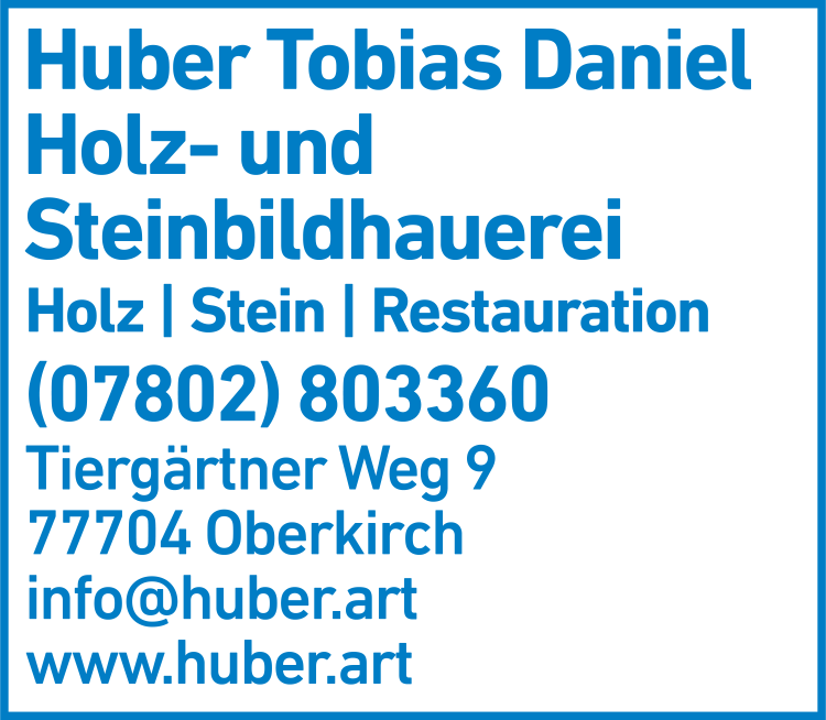 Die Adresse von Holz- u. Steinbildhauermeister Tobias D. Huber lautet: Tiergärtner Weg 9, 77704 Oberkirch