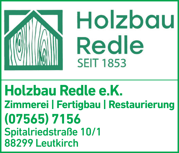 Die Adresse von Holzbau Redle e.K. lautet: Spitalriedstr. 10/1, 88299 Leutkirch im Allgäu